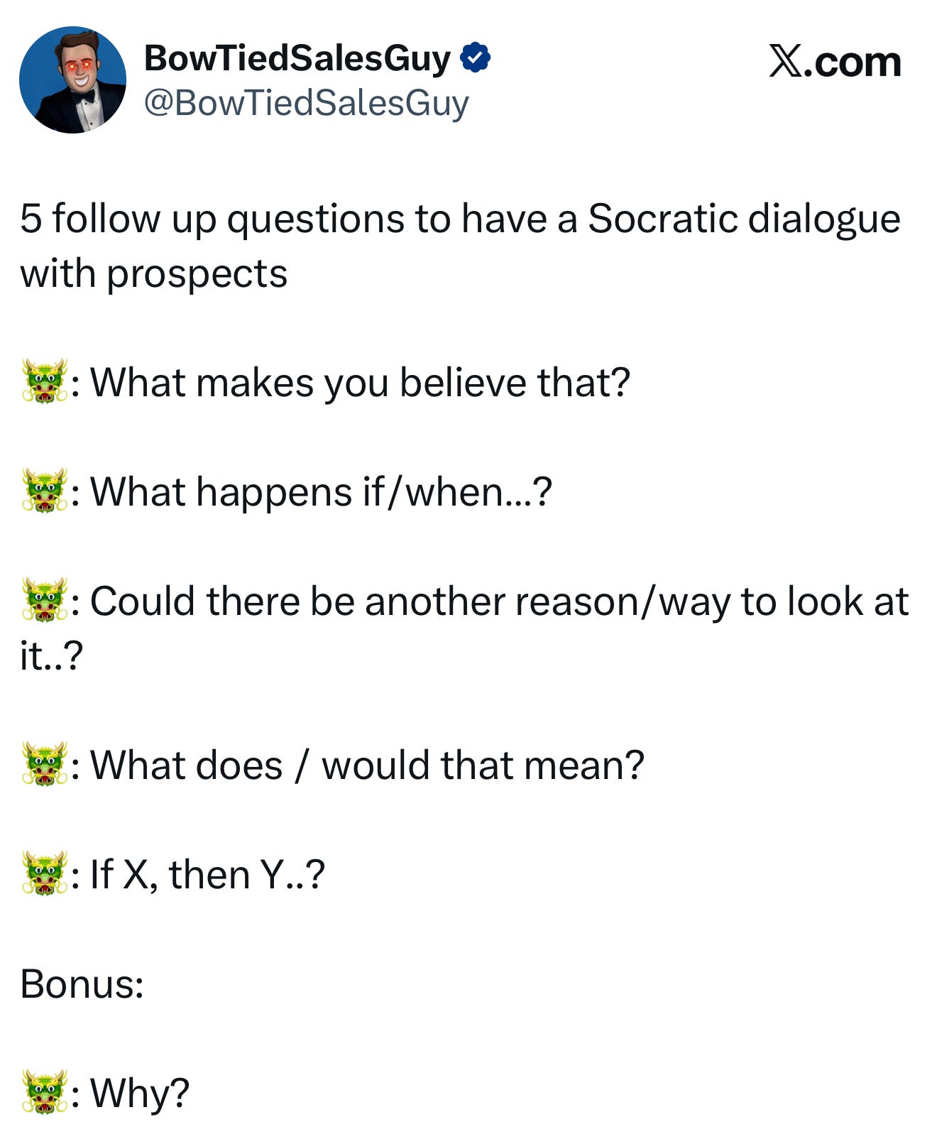 However, Socratic Questioning alone may not be enough. Not every prospect wants to play “21 questions” with you and sometimes you need to be more direct.